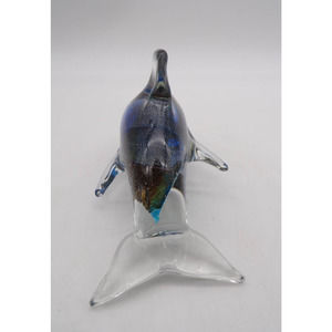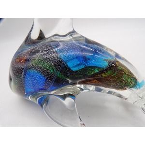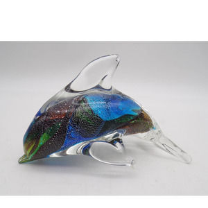Murano Hand Blown Glass Dolphin Paperweight Figurine Multicolor Ocean Tropical Marine Decor. Beautiful colors of green, silver and blue specks swirling through its body. Even a touch a red when tilting it a certain way. It is more beautiful in person than can be captured in the photos. The eyes are indented on the head. Measures 3" T x 5" L x 2 3/4" W. Excellent condition. No chips, scratches or cracks. Weight 9 oz.