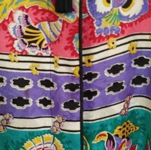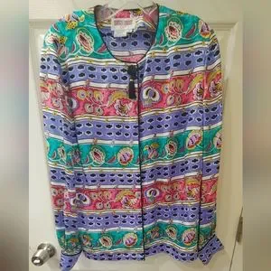 Maggie London Vintage, Oriental, Floral, Vibrant 100% Silk Women's Size 10 Blouse with a Scoop Neck, Black Tassel, and Hidden Buttons. Many Incorporated Colors, White, Black, Red, Teal, and Purple. Approximate Length 22 inches, Pit to Pit 22 inches, and Sleeve 25 inches.