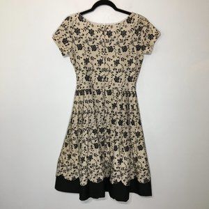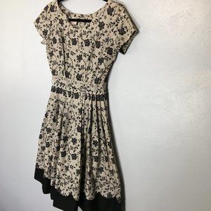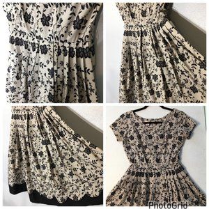Vintage 1950s tan fit and flare dress with black floral pattern. Super cute party dress with semi scalloped neckline and full pleated skirt. Matching belt pulls the look together. Adorable accented hem with scalloped floral against the solid black. Back metal Speed zipper with hook and thread (thread is broken.)