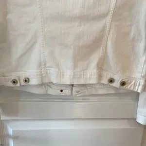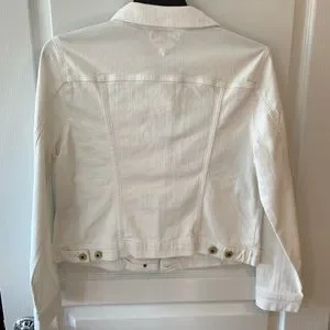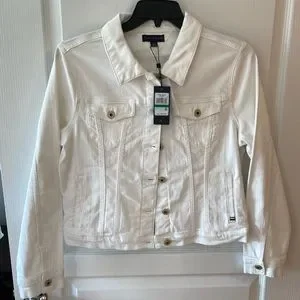 Tommy Hilfiger white denim jacket size L with goldstone buttons and side pockets. Measures approximately 20.5” pit to pit, 20.5” from shoulder to bottom, and 24.5” from shoulder to end of sleeve, New With Tags.