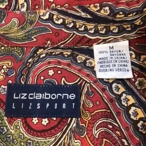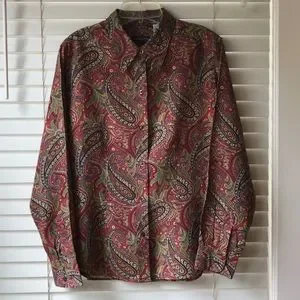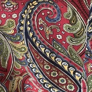 Dark red background with olive green, navy blue, dusty blue, yellow and cream paisleys and flowers.