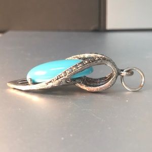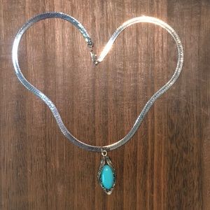Marcasite and faux turquoise pendant on an intricate bezel suspended from a substantial, gleaming silver-tone herringbone chain