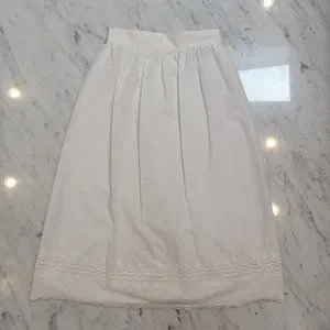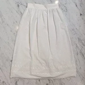 Look at this beautiful midi skirt! They just don't make them like this anymore. This sweet pastoral skirt features a lovely Swiss dot embroidered fabric with a floral lace border, and belt loops for a lovely 70s leather belt. Perfect for a girl's day or an aesthetic picnic! It would look lovely with an off-shoulder blouse or with a corset on top 🌼