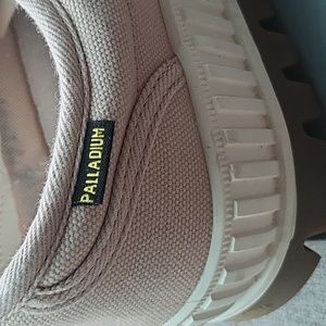Palladium L'originale depuis 1947, French import low top mens lace up clog/ biot/ shoes. in excellent condition! dust pink/white w/ gumsole. although shoe is size 10 1/2, these are suited for a size 10. French size varies since knowing of palladium shoes the 1/2 size up is so u can put insoles for comfort but then will fit a size 10 perfectly. sometimes fashion is not always practical. just wanted to share that.