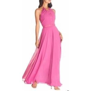 NWT New Dress the Population Odette Maxi Halter Neck Layered Dress in Hibiscus