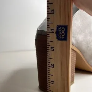 4 inch heel, but very comfortable shoe. There is a small stain that looks like a light pen mark on the right shoe above the heel and is shown in last pic and dents and scratches on the sole. Otherwise in excellent preowned condition.