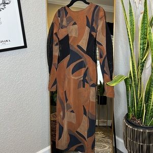 House of CB 'Cassidy' Brown Mesh Printed Long Sleeve Midi Dress NWOT