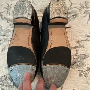 Size 5 Dancing Fair Tap Shoes with grips. The inside did have a heel insole but has been removed. Lots of life left in these taps.