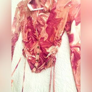 Sheet top with beautiful tie die swirls of pinks and Maeve’s.