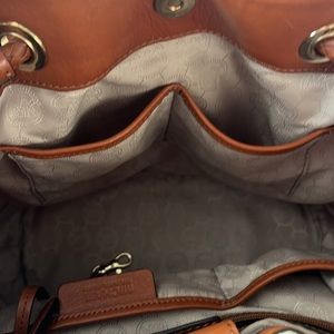 Stylish shoulder bag with signature MK pattern. Features brown leather accents and tassel details. Gold hardware adds elegance.