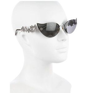 Limited Edition 408/1000. Silver-tone Louis Vuitton cat-eye sunglasses with Swarovski crystal fleur embellishments at arms and black tinted lenses and adjustable nose pads. Look 19 from the Spring 2003 Runway. Includes case and dust cloth.