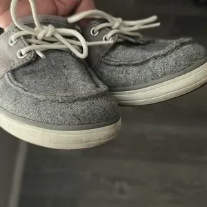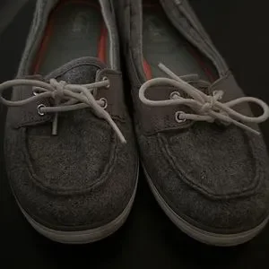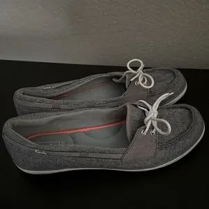 Used fashion sneaker Size 8 gray boat shoe from Keds with white shoe laces.