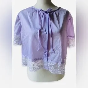 Vintage lilac nylon night cape with bow tie front, buttons and lace detailing.