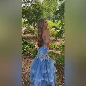 Gorgeous blue prom dress with silver accents and a lace poof out train. Back is lace up and dress is altered a bit in the waist. Size 2 true but would most likely fit 0-2. Altercations were $150 due to having beads removed and re-sewn on. Worn once and is in amazing condition.