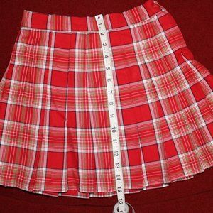 This cute pleated skirt has a red, tan and white color scheme. The back of the waistband is stretchy. This type of pleated skirt with the stretchy back waistband needs to be fully stretched for the pleats to hang properly. When fully stretched, the waistband is about 29 inches. I love the skirt, but unfortunately, it does not allow me to breathe LOL. I will try to find it one size larger. The skirt is in excellent condition.