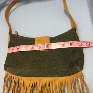 Very nice smaller size purse, denim body with leather strap and tassels, measurements shown in photos