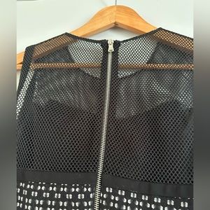 Rachel by Rachel Roy Faux Leather Trim Mini Dress size 12. Great condition. Faux leather and mesh trim with black and white pattern on fabric. Zipper on back.