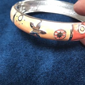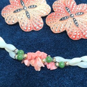 Such a sweet set of inner twined mother of pearl beads, pink coral, and jade beads. The earrings are lightweight clip and the bracelet is a snap on bracelet that matches making it a complete set in their own handmade gift boxes. Offers accepted