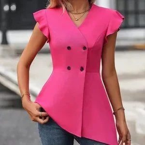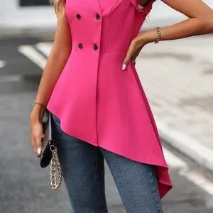 Ruffle Trim Double Breasted Asymmetrical Hem Blazer Hot Pink