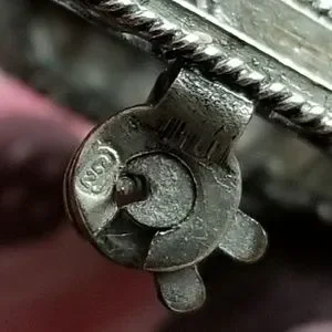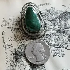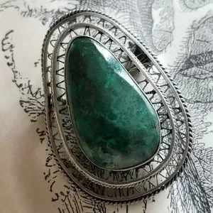 This wonderful vintage brooch has an Eilat stone cabochon set in silver tone filigree backing. Eilat stones were mined only in South Israel in the Timna Mines, known also as the King Solomon Mines. The stone is no longer being mined and the Eilat stone deposit is believed to be depleted. Eilat is the national gemstone of Israel. Signed on the clasp, I think it says C2J (?) This piece is in very good condition with normal natural flaws and patina. From a smoke free home:)