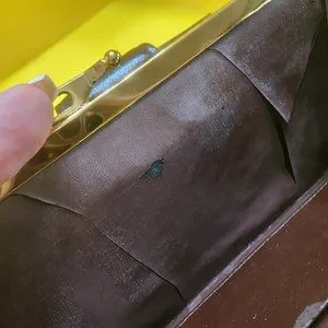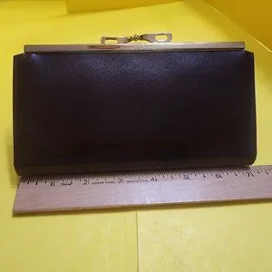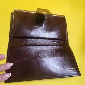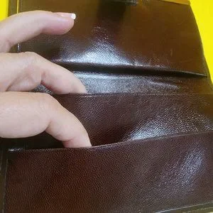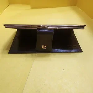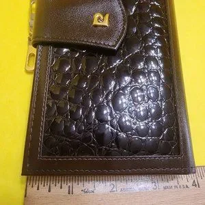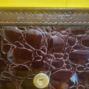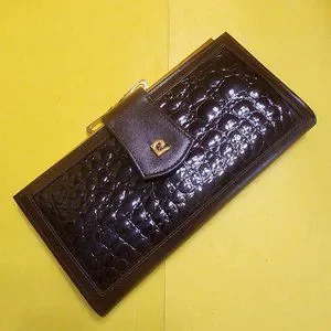 Crocodile in the front and Calf Skin in the rest. In excellent shape, never used, inside of coin purse lining is cracked and a bit disintegrated due to being closed for so many years. 2 slots and plastic organizer for cards and pictures. Kisslock!