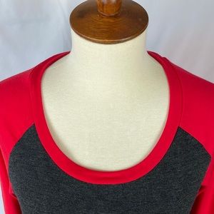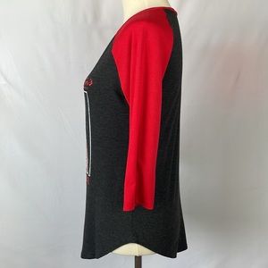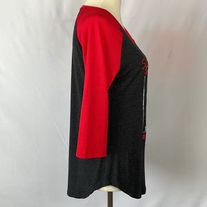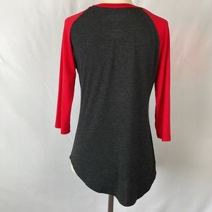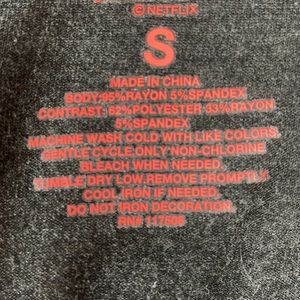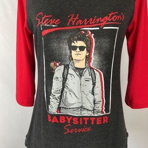 Extra soft! Baseball style tee with 3/4 length red sleeves from Stranger Things. Dark charcoal gray body with graphic "Steve Harrington's Babysitter Service" and photo on the front. Round hem seems asymmetrical in back. Round neckline. Fabric is very soft, and has stretch. Perfect for your favorite Stranger Things fan! EUC. Size Small.
