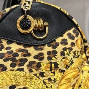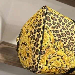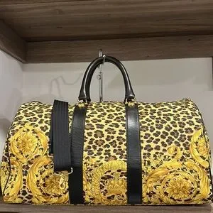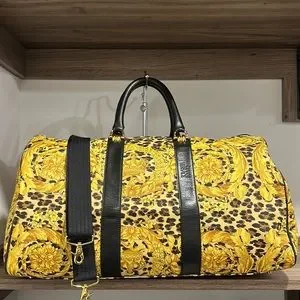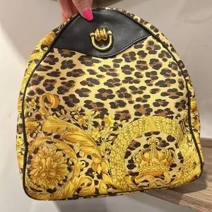 Stunning Gianni Versace travel bag in baroque print on leopard background! Not one head will not turn while traveling with this! Beautiful preowned condition, with minor signs of wear. Please zoom in on photos as they are part of the description.