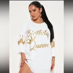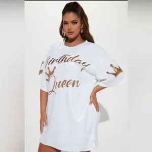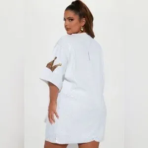 Fashion Nova: white sequin detail short dress. Short sleeve, crew neck, tunic.