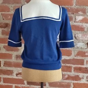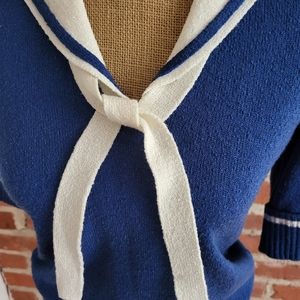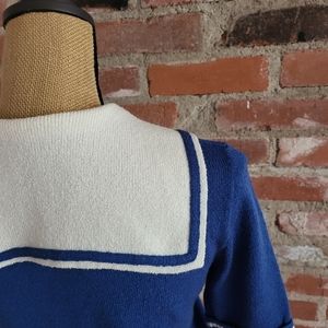 James Kenrob by Dalton vintage 80s acrylic sailor sweater with short sleeves, sailor collar, and neck tie in blue and white knit.