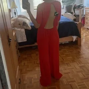 A beautiful BCBG red orange jumpsuit with open back. This one has never been worn and still has the tags. The fabric is light and flowy making it perfect a night out. XS