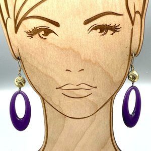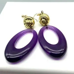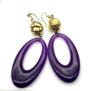 Unique Elongated Hoop Dangle Earrings, Gold Tone Vintage Knot drops to Purple Lucite Oval, Lovely Shoulder Dusters
