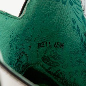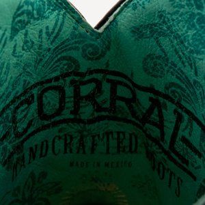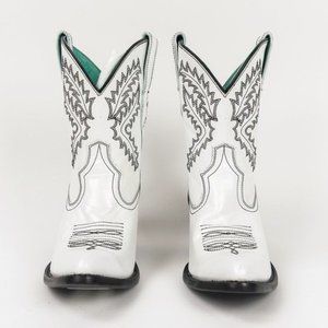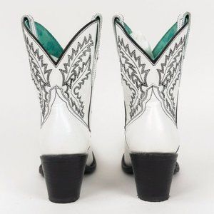 These short cowboy boots from Corral are made in a bright white full-grain leather with black contrast western-style embroidery. With Goodyear welted construction, they feature stacked block heels, snip toes, and teal-printed lining and insoles.