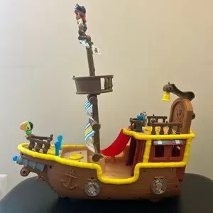 Jake's musical pirate ship, Bucky, sets sail straight from Never Land to your living room! Bucky is fully equipped to battle Hook and his crew to defend Jake's treasure. The crow's nest lets Jake spot Hook on the water, and the spring-loaded canon fires water-ball projectiles. The Tick Tock Croc hides behind a hidden trap door. Bucky is packed with 25 action phrases and songs. Ready for a new adventure? Roll Bucky on its wheels and set sail, rocking side to side! Bucky comes with Jake and Skully figures and three water-ball projectiles. (Not intended for use in water.)