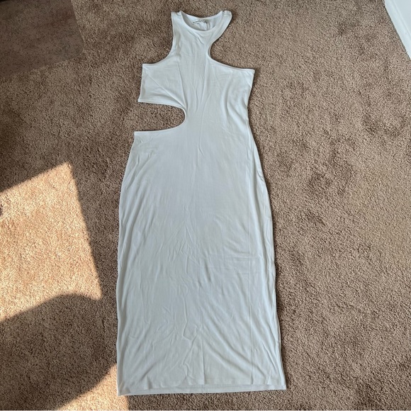 This is a white cut-out midi dress from Abercrombie & Fitch in size large tall. The dress has a slit on the left leg that goes a little above my mid-thigh. The material is very soft, ribbed, and stretchy. Condition is new with tags and only worn to try on.