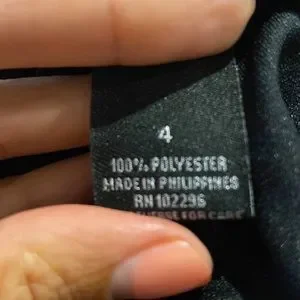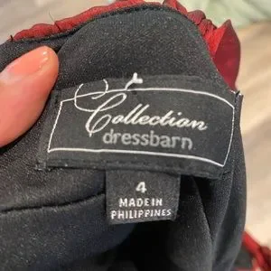 This is a size 4 deep red dress, with black undertones.It hits just below my knees (I’m 5’6”). It has a zipper in the back, it’s made from polyester and is dry clean only. I wore this once for a Christmas party. It comes from a smoke free home. It is in excellent condition.