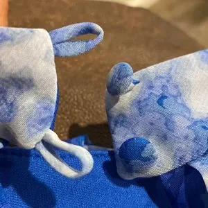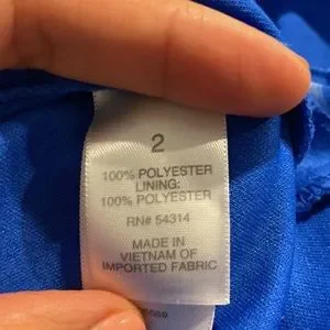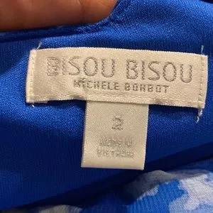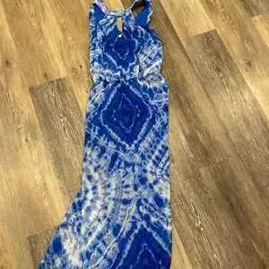 This is a size 2 blue maxi dress from Bisou Bisou. It has a keyhole on the front and back of the dress. There are two buttons on the back neck area. It has an elastic waist and it’s very lightweight and flowy in shades of blue and white. There is sheer material on top of a layer of solid blue. It is in excellent condition. It is made from polyester material and is machine wash cold. Smoke free home