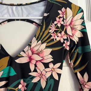 Embrace floral prints in the After Sunset One Piece Swimsuit from Billabong. This stunning one-piece features a v-neckline, cutout back detail, long sleeves, and cheeky seat coverage.