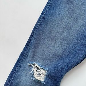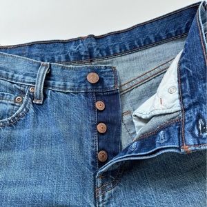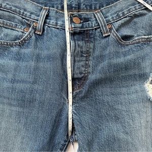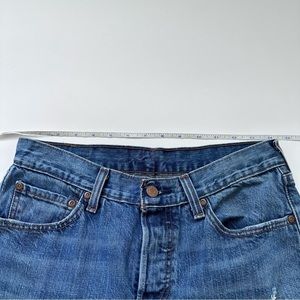 Levi’s 501 original fit, waist 27 length 32. 100% cotton, non stretch denim. Button fly and 5- pocket style. Straight through the hip and thigh. Please see measurements in pictures. Has a dark spot near distressing, please see last picture.