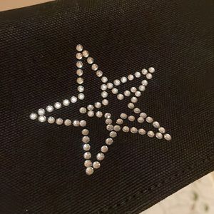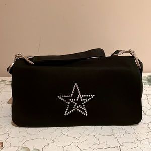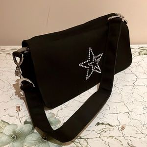 New York runway icon Eddie Funkhouser essential black canvas shoulder bag. Magnetic button flap and an inner zipper main compartment. Signature star diamanté logo on flap and signature logo zipper. Brand new in bag