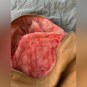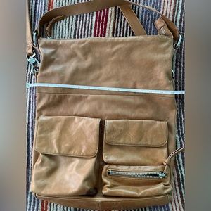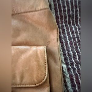 Buttery soft honey leather HOBO crossbody. Top folds over and also zips shut. A whopping SEVEN pockets! Three exterior: one large, magnet closure; one medium, magnet closure; one small, zip closure. Stain at bottom of large pocket, pictured. Four interior pockets: one large zip, one medium open, two smaller side by side open. Plus a card holder, pictured. Small mark exterior front, pictured. Interior spic and span. Crossbody strap is adjustable and removable. Second strap for shoulder or forearm is affixed.