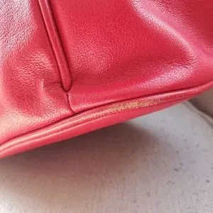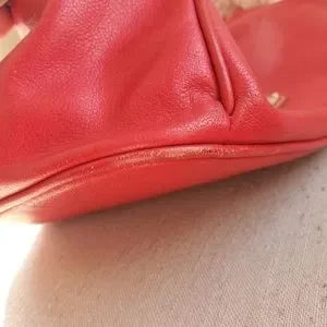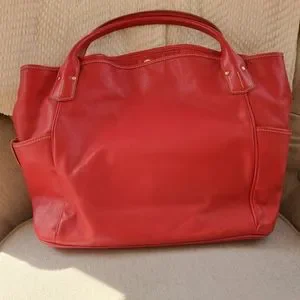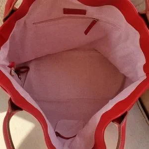 Extra large red Dooney and Bourke tote with white and pink patterned interior. 1 zipper pouch, 1 phone pocket, and key attachment inside. Key attachment is worn,see photos for reference. 2 exterior side pockets. Extra wide opening with button clasp. Can literally fit a 3 year old inside the interior is so big. I tried so you wouldn't have to! Some wear around bottom corners and 1 spot on exterior, all in photos.