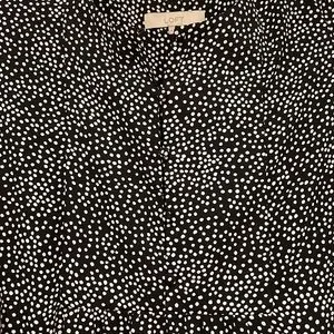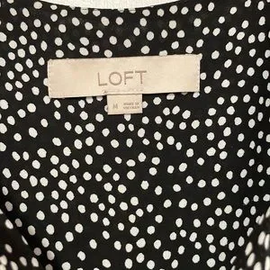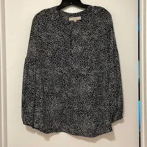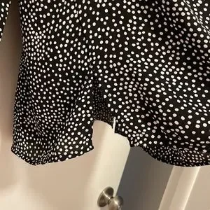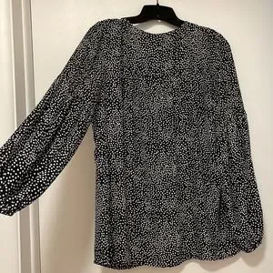 White polka dot long sleeve blouse. Top part of the sleeves are fitted, bottom part are balloon. Has an oversized, flowy fit with small slits on both sides. Top front has function buttons. Size M.