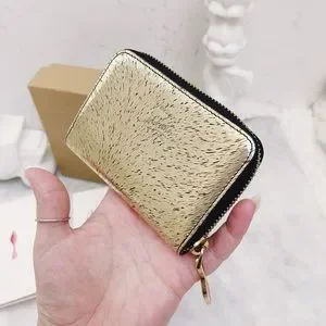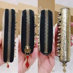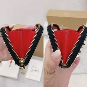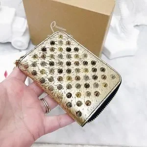 Authentic Christian Louboutin RARE Metallic Tri-Toned Compact Zip Wallet / Coin Purse / Card Pouch. Made in Italy- crafted in calfskin leather in a black brushed metallic light gold with shiny light gold toned hardware. Panettone spiked / studded style with spikes in tones of rose gold, gold, silver and gunmetal. Black contrast zipper fabric. 3/4 zip closure with classic red sole zipper pull charm. Bright red leather interior. One card slot on each side (2 total) with an opened center. In excellent pre owned condition. Light signs of wear to the tops of the spikes, signs of use to the interior and some wear to the inside leather underneath the zipper track (pictured). Nothing at all noticeable when using - looks like new when using. Includes original box and care cards only. Message for further details.