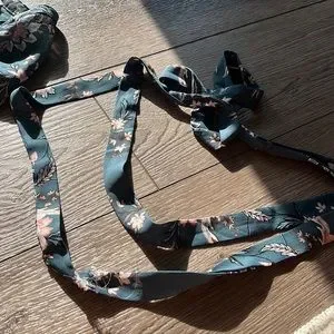Distress/fraying to the tie that goes around the shirt. See photo