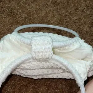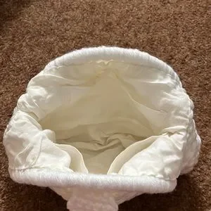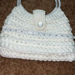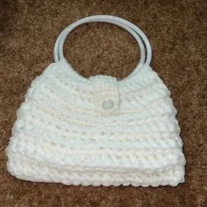Vintage Crocheted handbag in white/of white color item has plastic white/clear circle hoops for handles. Item sold as is. The inside of bag has 4 side pockets.