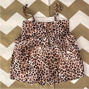 Tan white and black leopard animal print romper. Thin straps with bows on the shoulders. Ruffle around the waist and wide leg opening on the bottom. Full lining and buttons on the back. New with tags. Perfect for summer with a pair of sunglasses from my closet.