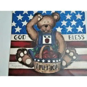Patriotic gift bag features a saluting bear with the saying, "God Bless America"