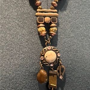 Mix of pink stones, bronze highlights, metals, glass crystals and natural colored stones. The set is an artistic blend of Erica’s greatest hits! The matching earrings are adorable; pierced ears, about 2.5” long. The adjustable necklace can be extended to 30"+. Purchased at Carson Pierre Scott in Lombard, Illinois. Never worn!