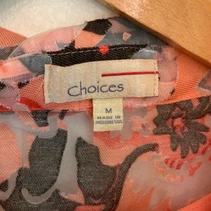 Choices sheer top with shades of black, salmon, peach. Collar and button tab 3/4 sleeves. Listing is for Choices top only. Other items shown for color comparison. Approximately 24 1/2 inches from shoulder to waist. Approximately 20 inches across at chest.