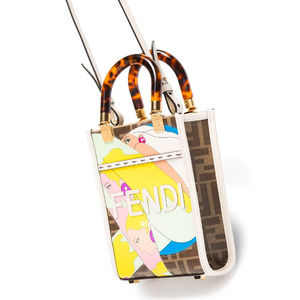 Brand new Fendi Mini Sunshine Shopper bag in fabric with FF motif, multicolor leather hand inlay and embellished with embossed FENDI lettering. The Hairdo Girls graphics are a tribute to the visionary sensitivity of the fashion illustrator Antonio Lopez: recalling the atmospheres of the disco era and an expression of the free and universal femininity that distinguishes the Fendi spirit.